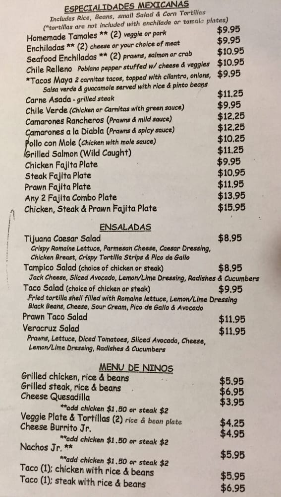 Two prawn-stuffed enchiladas, topped with red or green sauce and sour cream. Served with rice, choice of beans, and salad.